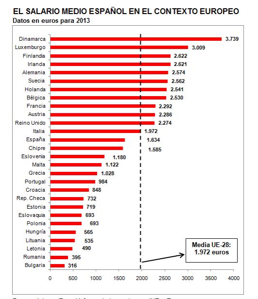 La comparación con los grandes países europeos, como Alemania, Francia, Gran Bretaña e Italia, nos deja bastante rezagados, con unos salarios medios muy bajos.